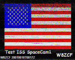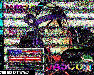Attached is a picture from Yoshi, JA5CU, Kawasaki, Japan that which he sent to Farrell Winder W8ZCF via AO-40, Transponder S2, Rx on SpaceCAm1. You will note Yoshi included a replay of my picture ( flag of USA) down in lower left which I sent to him earlier using the SpaceCam1 IBM 760 XD/VOX Box. Satellite was down to about a 2 deg elevation and out some 32,000 miles range at the time..