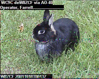 Here are a couple of pictures sent via SpaceCam1 and received by Al Lyday, WC9C in Pimento, October 9, 2001. We think the noise is definitely radars operating in the 70 cm band. 73, Farrell.