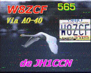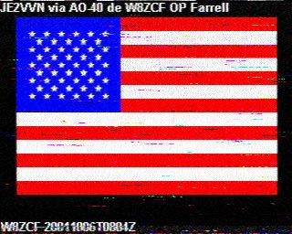 Here is a copy of a picture received by by Tetsuhire Inoue, (Hiro), JE2VVN in Japan which I transmitted through AMSAT AO-40. The remarkable thing is that the elevation of AO-40 was under 1 degree at the the time of this transmission. This picture was sent using Jim Barber, N7CXI's software, SpaceCam1, (Scottie 1) with the IBM 760 XD and Lou McFadin, W5DID's VOX Box feeding a Yaesu 736R. I was unable to get a good picture from Hiro before losing the satellite over the horizon. All pictures thru AO-40 seem to have some interference in the form of noise spikes which are more apparent in the white areas, for example, in this flag picture. It has been sugested that these spikes are coming from radars transmitting in the 70 cm band. We would not expect to see this interference when pictures are transmitted from the International Space Station. 73, Farrell, W8ZCF.