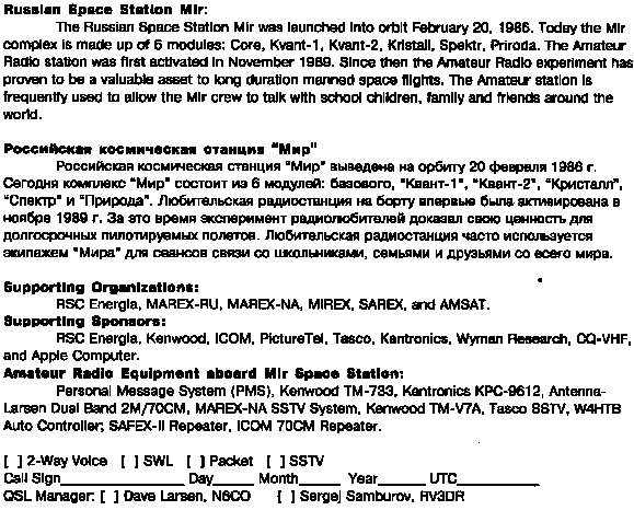 Note: We are currently out of QSL cards for the Mir Amateur Radio project. The MAREX-MG team has designed a new Mir QSL card and we have sent the card to MAREX-RU for final approval. We hope to send the final card to the printers in January 2000. I would like to thank you all for being patient on getting your QSL cards. We hope to begin shipping the new cards in Q1 2000.