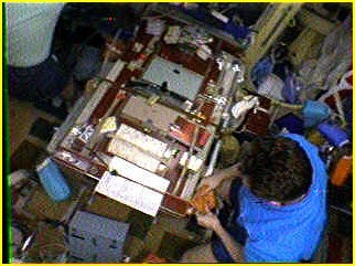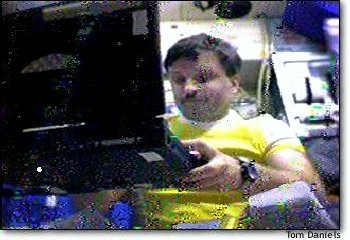 Cosmonaut Alexander Kaleri is working on a lap-top computer. He is located in the Mir Core, or Base-Block module of the Space Station. He's sitting at a table which doubles as a work bench and oven for heating food. Above his head and to the right a little, are two glowing objects. The larger, square object is the display on the MAREX-MG Tasco SSTV system. Just above the display is a bluish rectangle display of the Kenwood TM-V7 Transceiver, which is used to send the images to Earth from the Russian Space Station Mir. - WF1F