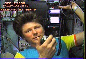 The Mir Space Station with its re-entry plunge to Earth has taken with it several historical Amateur Radio Systems. Among these is the SSTV package developed specifically for Mir by the MAREX-NA group. Using the SSTV setup the Mir crews sent thousands of exciting "live" pictures to Earth. Dr. Don Miller, W9NTP received one of the 1st images. Don was also one of the developers of the Mir System. This picture was received on December 12, 1998 :
